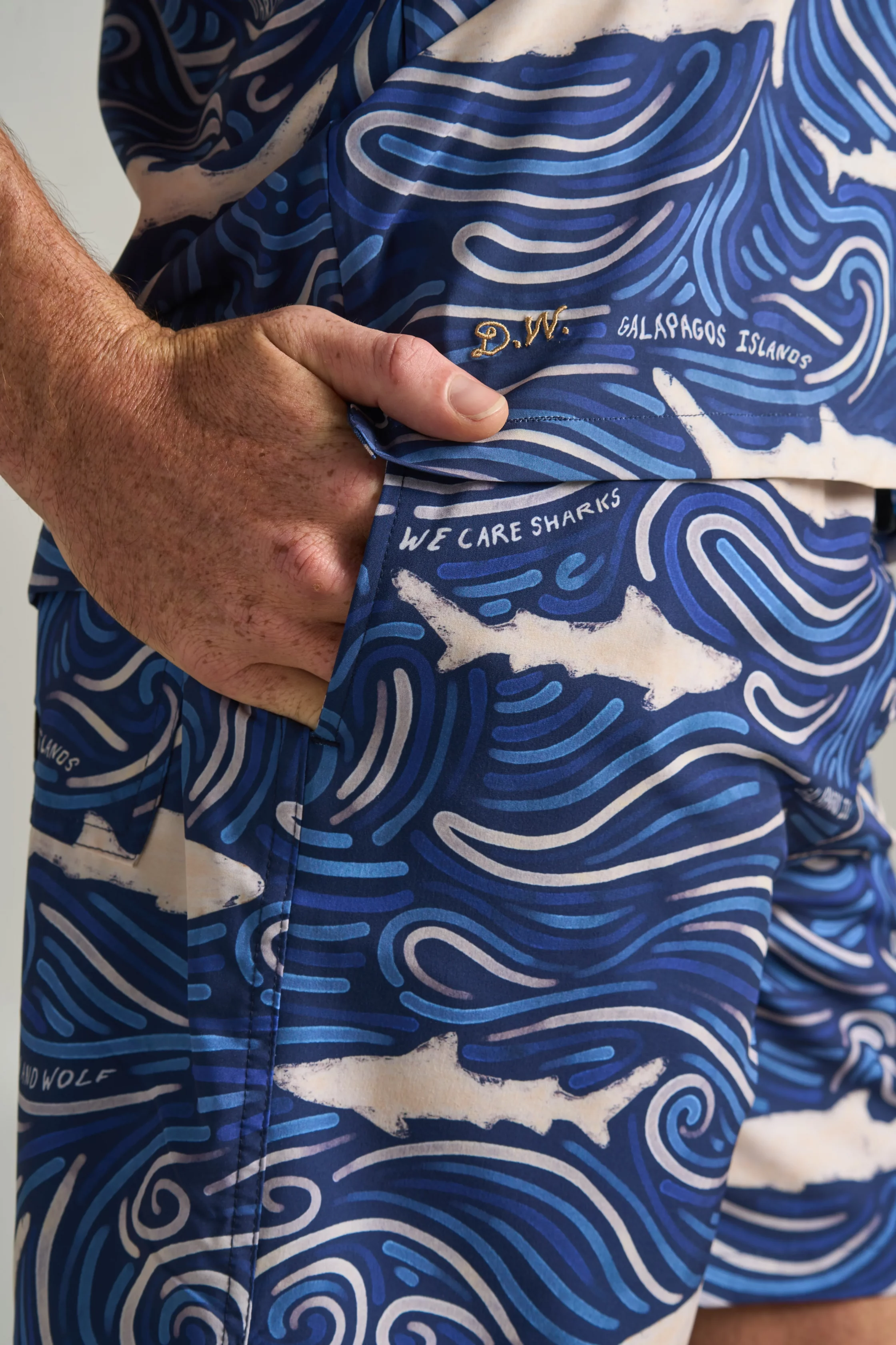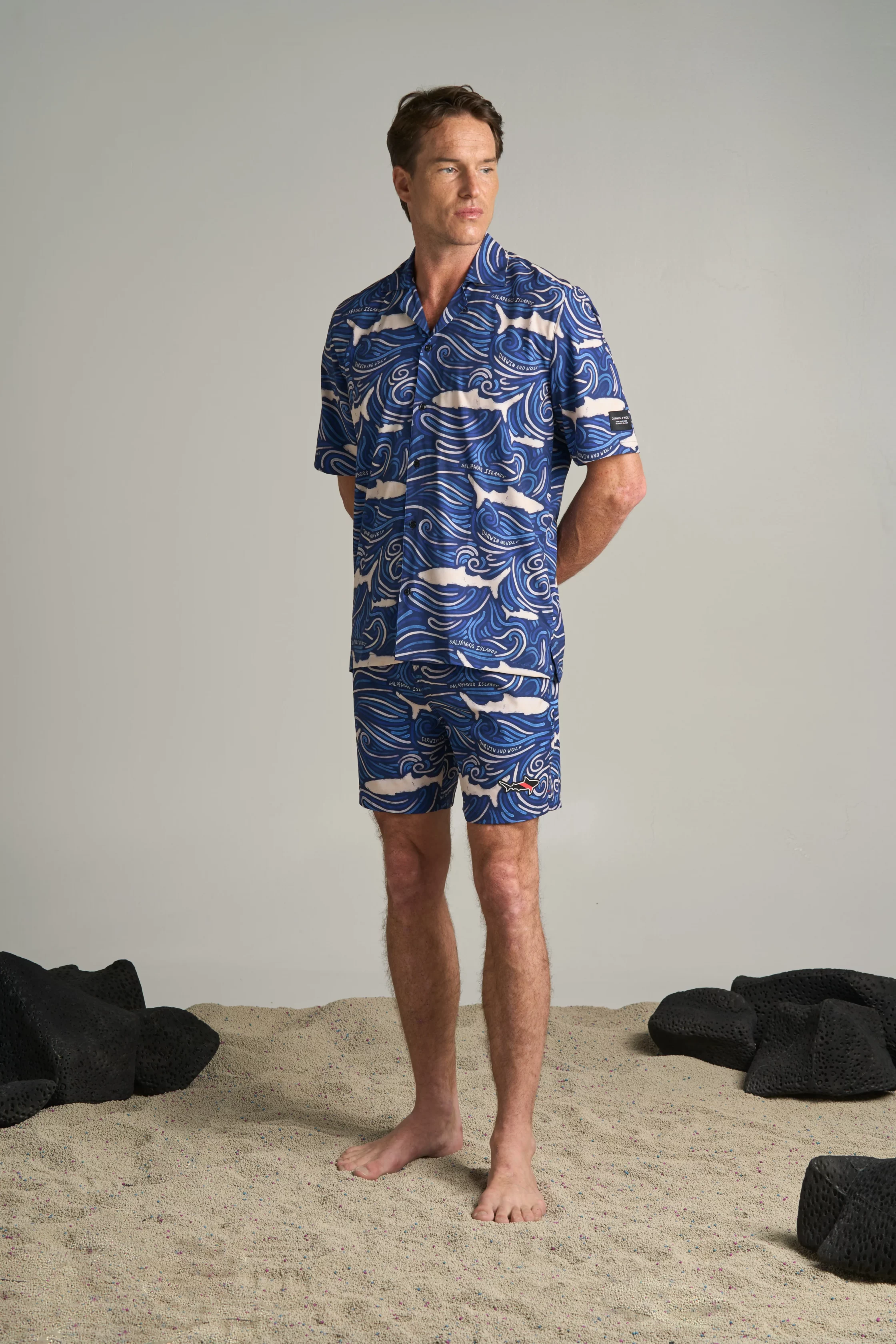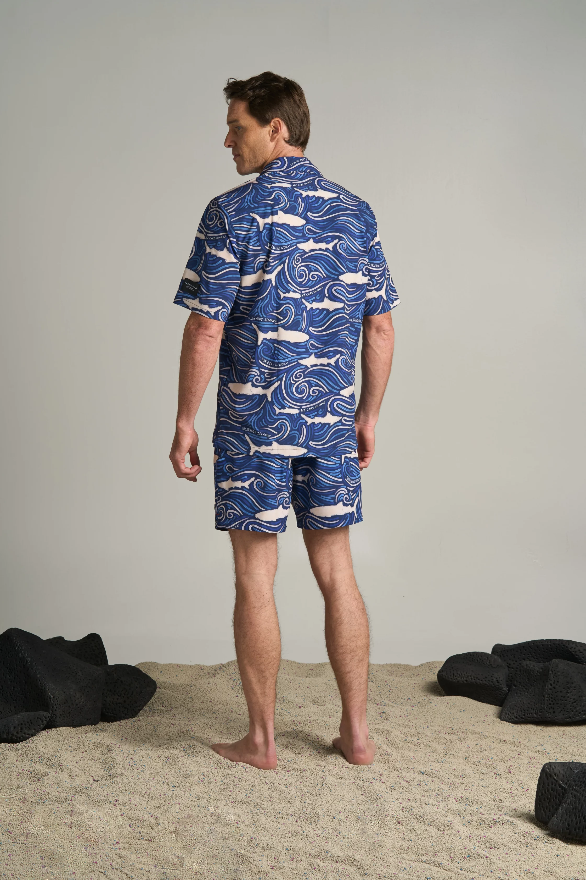 Camisa hawaiana de hombre en poliéster reciclado y spandex, con tiburones martillo y ondas que reflejan frescura, energía oceánica y estilo sostenible.