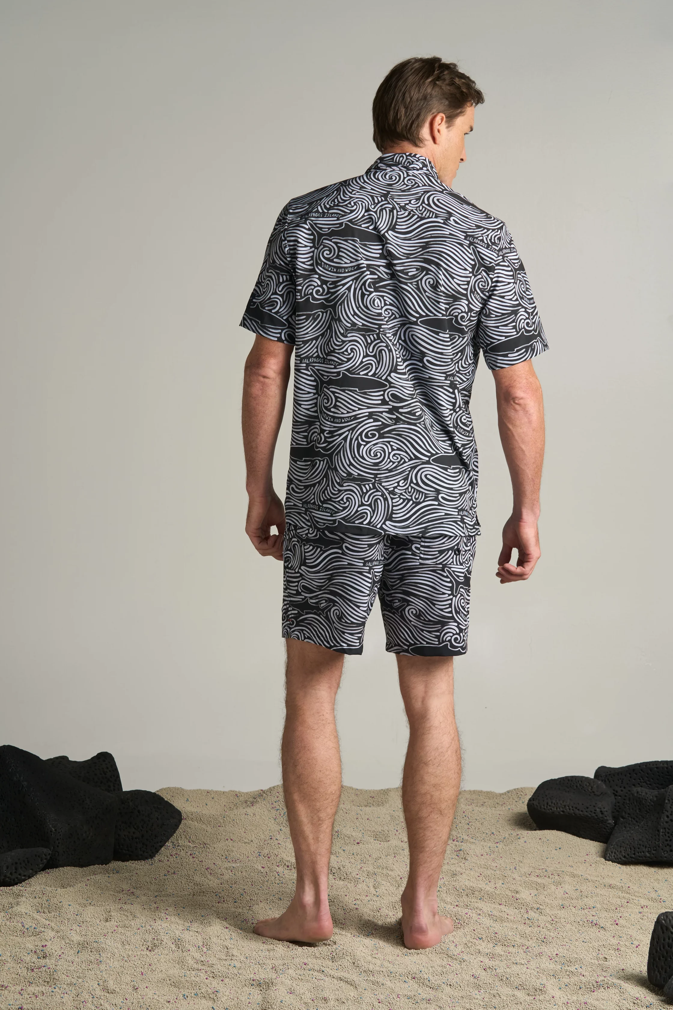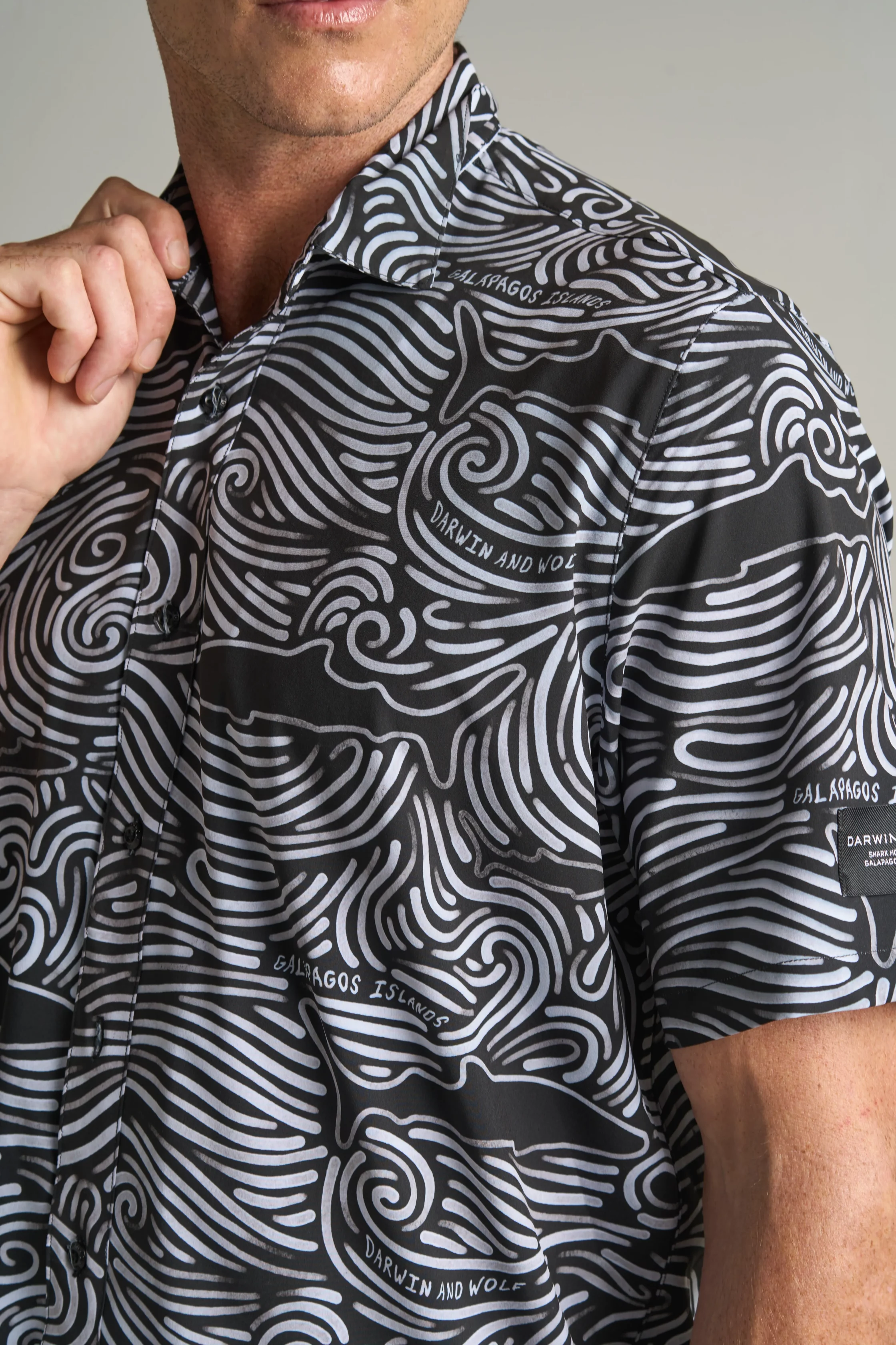 Camisa Hawaiana Manga Corta Corrientes y Tiburónes Blanco y Negro