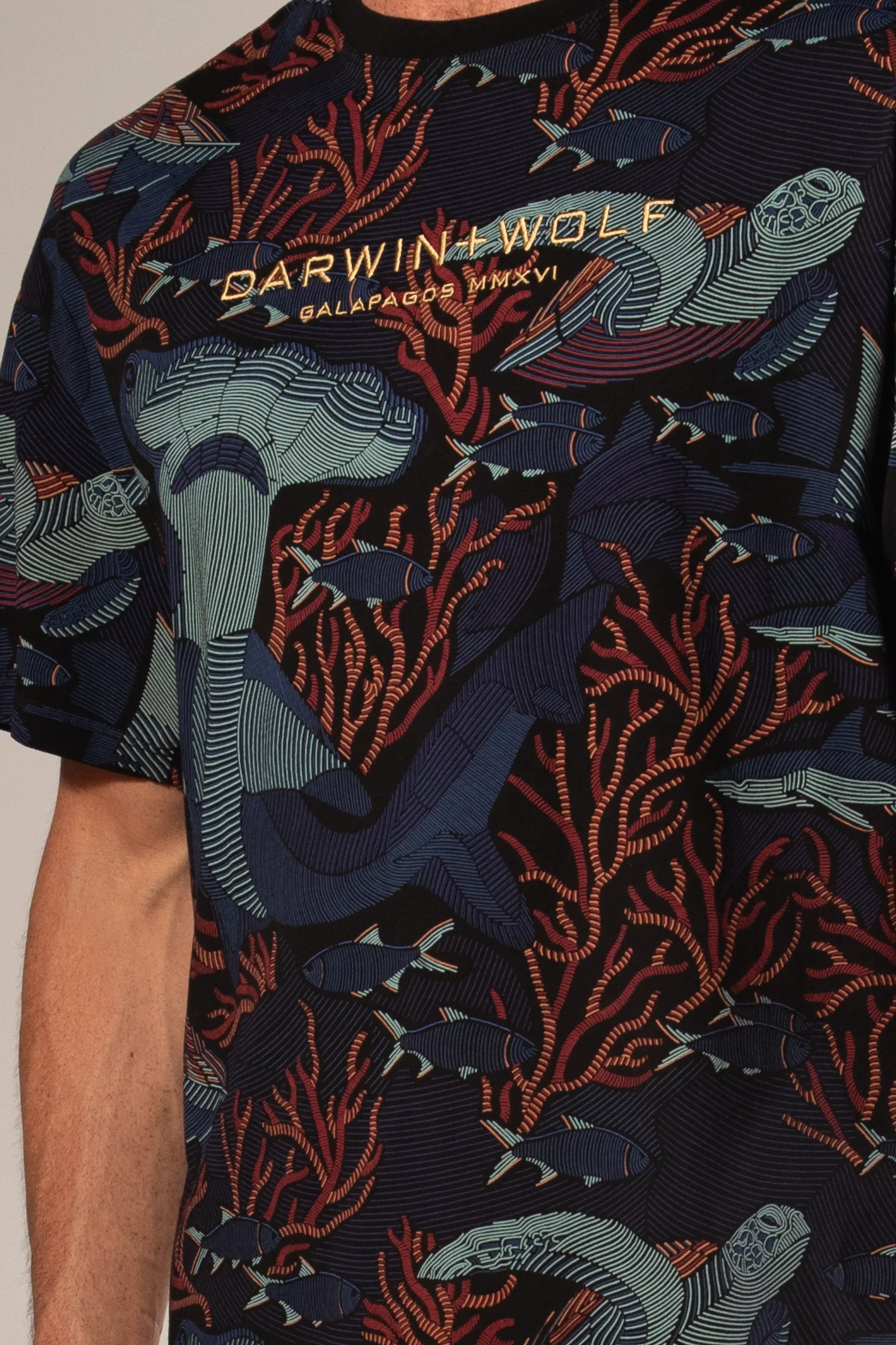 Camiseta de hombre con arte de arrecife marino y tiburón martillo, bordado dorado de la marca en el pecho.