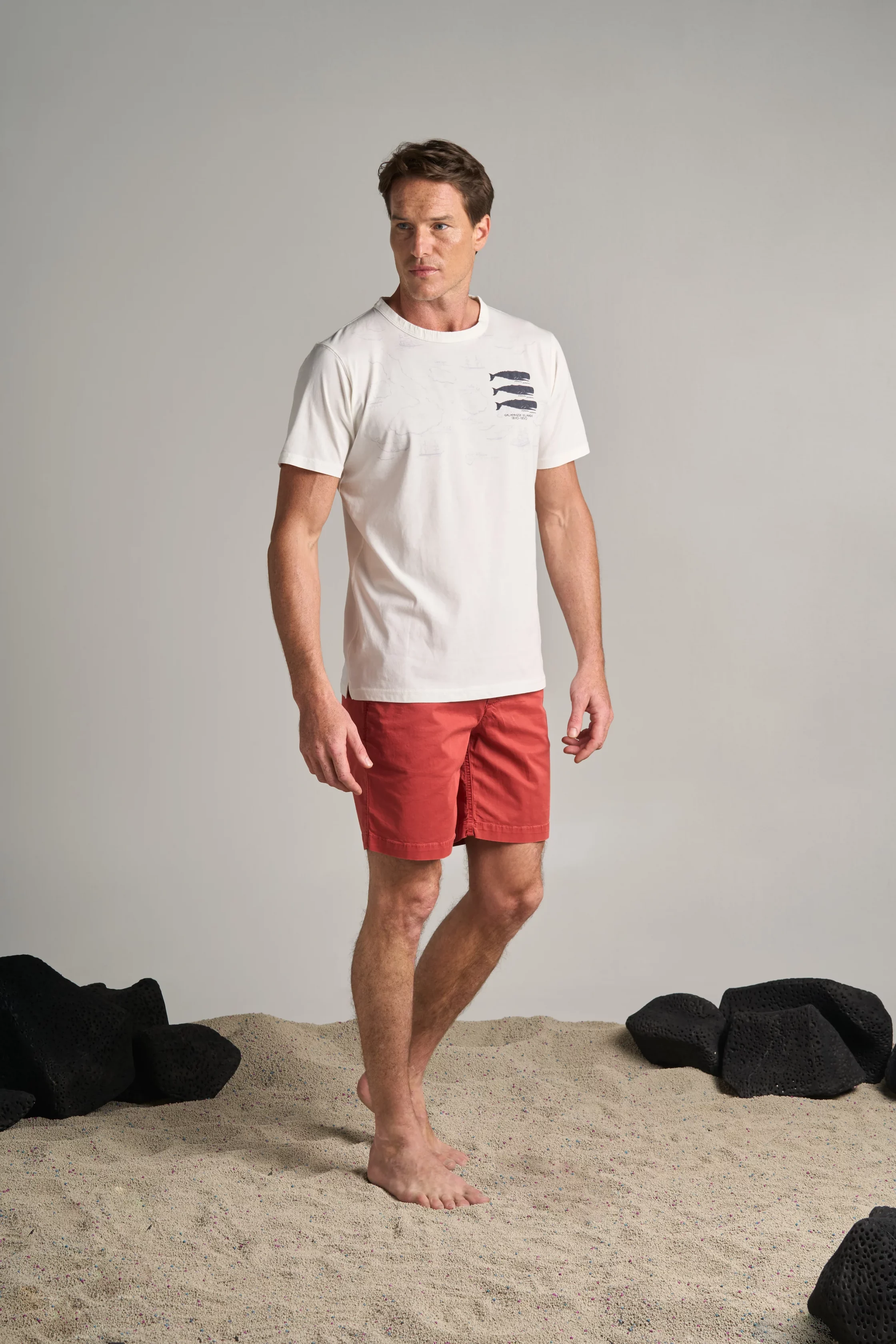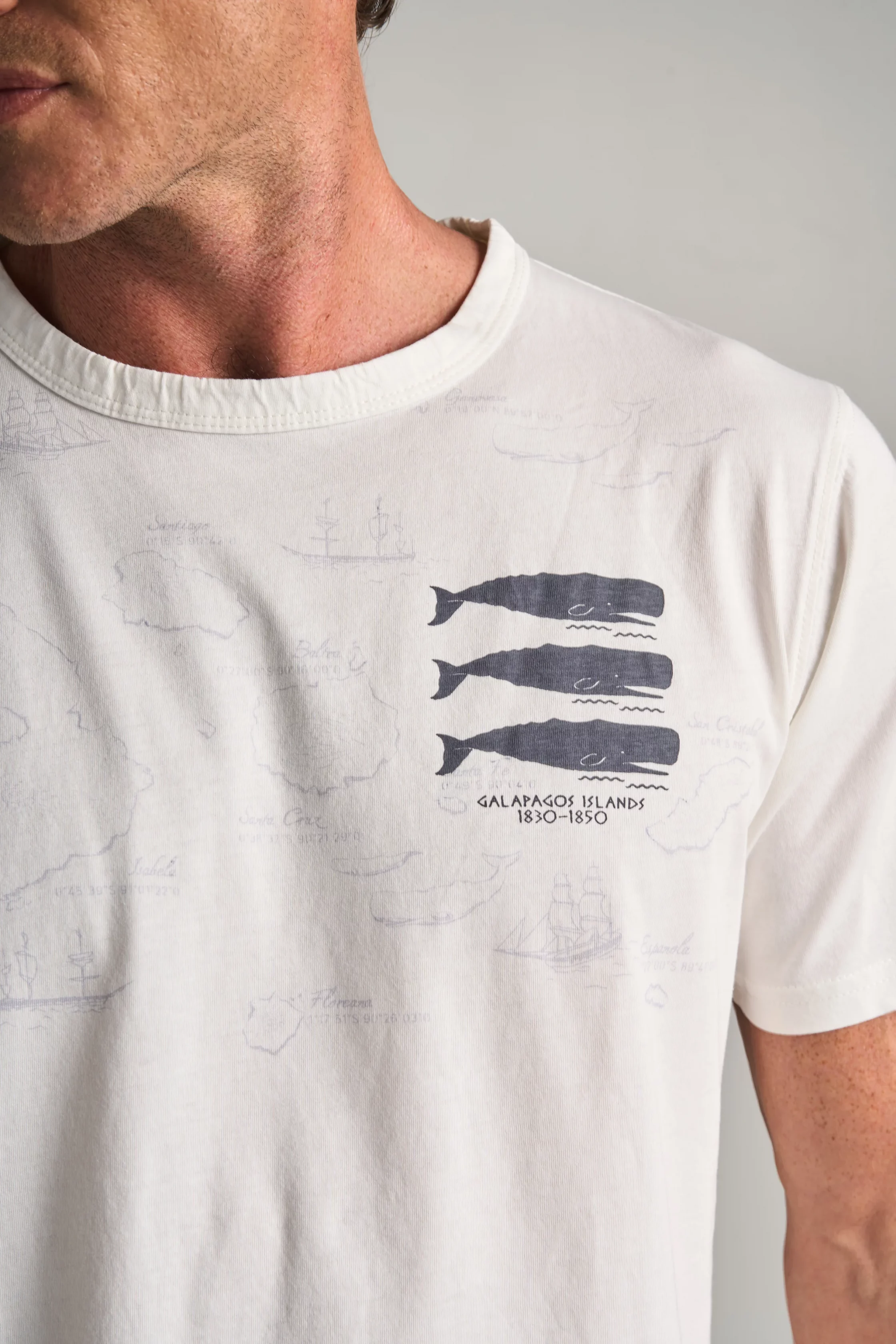 Camiseta blanca de hombre en 100% algodón, con mapa Galápagos y detalles de marca que reflejan autenticidad y frescura, aportando estilo versátil al guardarropa.