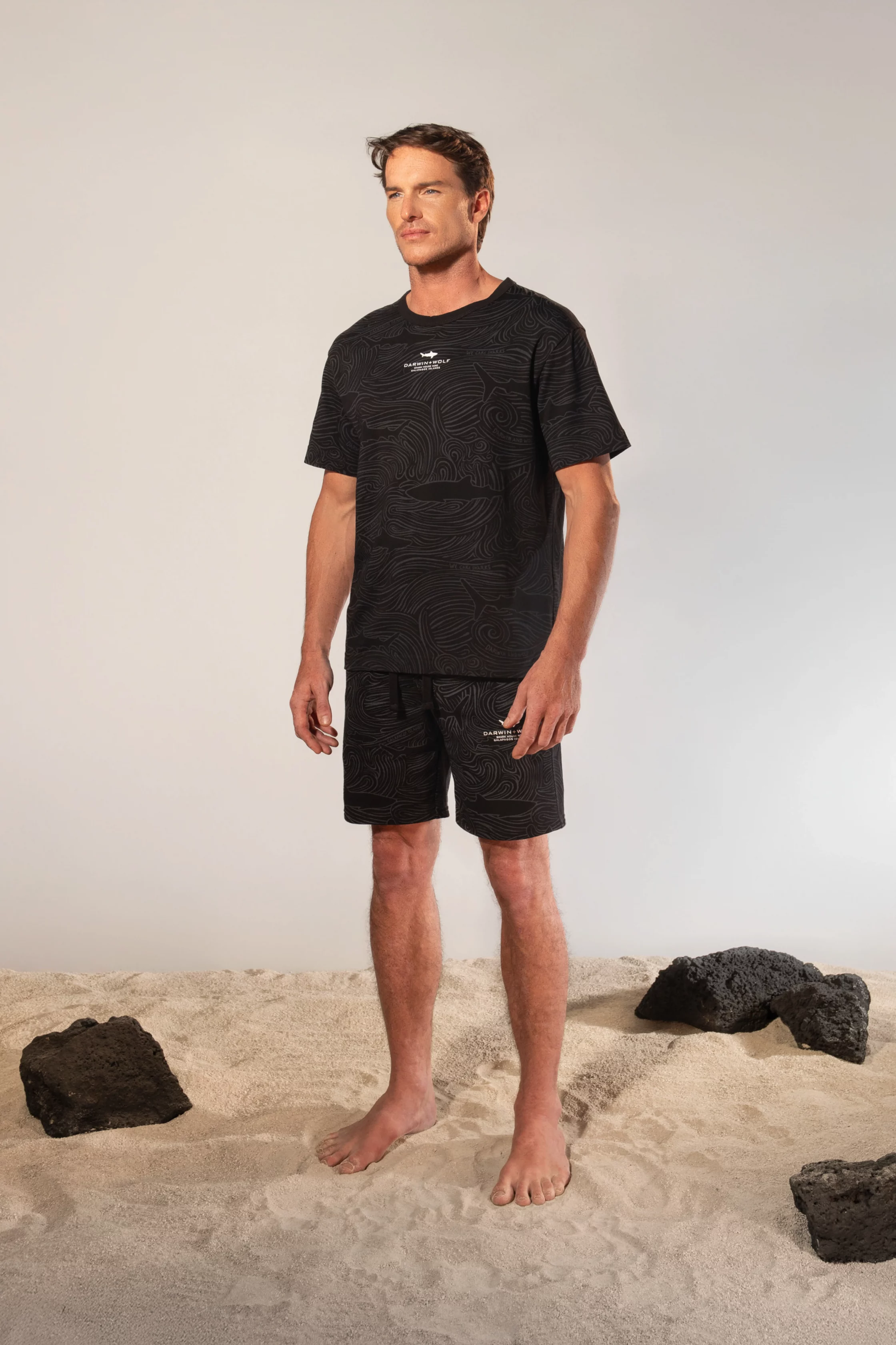 Camiseta negra de hombre en 100% algodón, con arte de corrientes y tiburones, detalles de marca y coordenadas que reflejan energía y espíritu explorador.