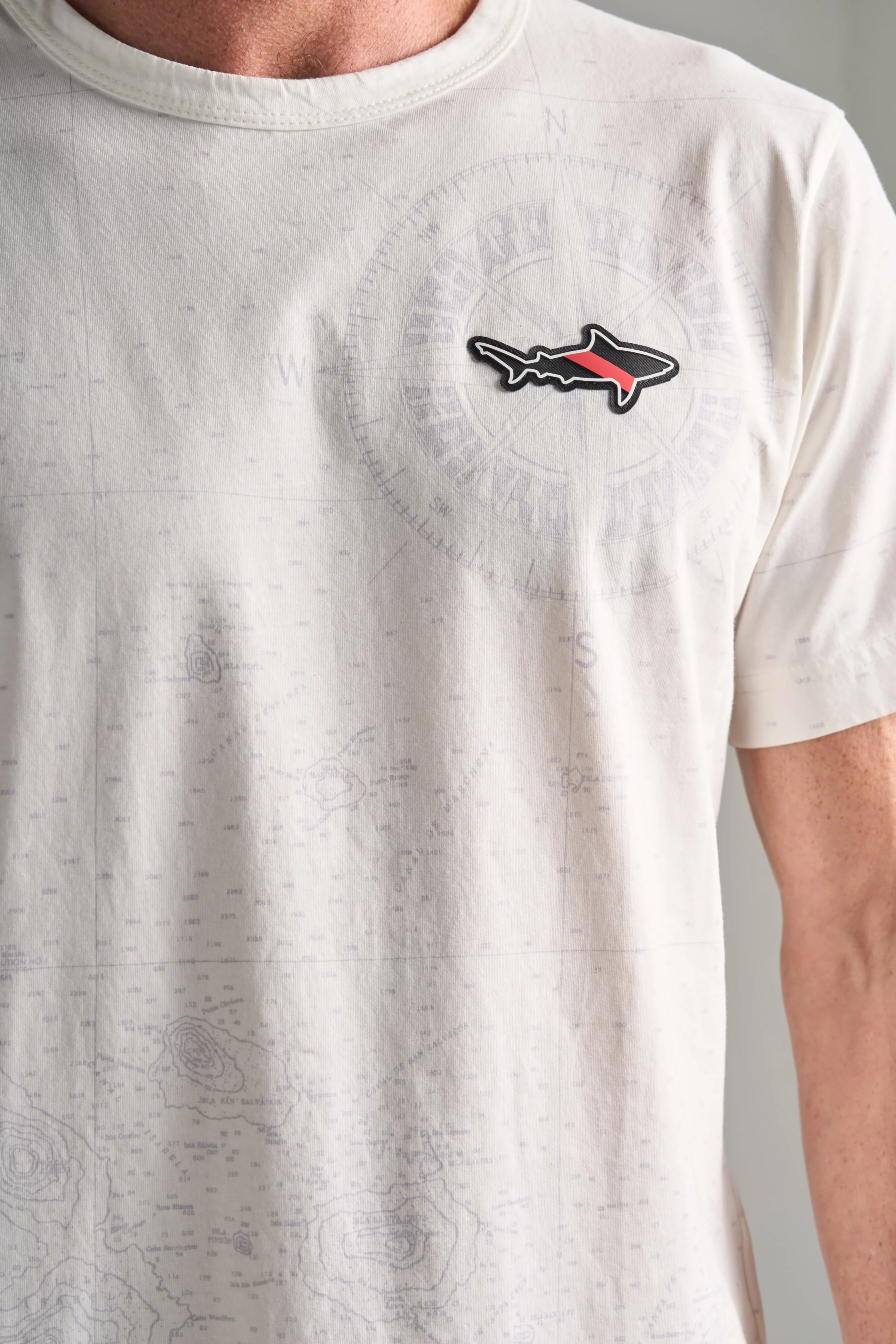 Camiseta blanca de hombre en 100% algodón, con mapa Galápagos y detalles de marca que reflejan autenticidad y frescura, aportando estilo versátil al guardarropa.