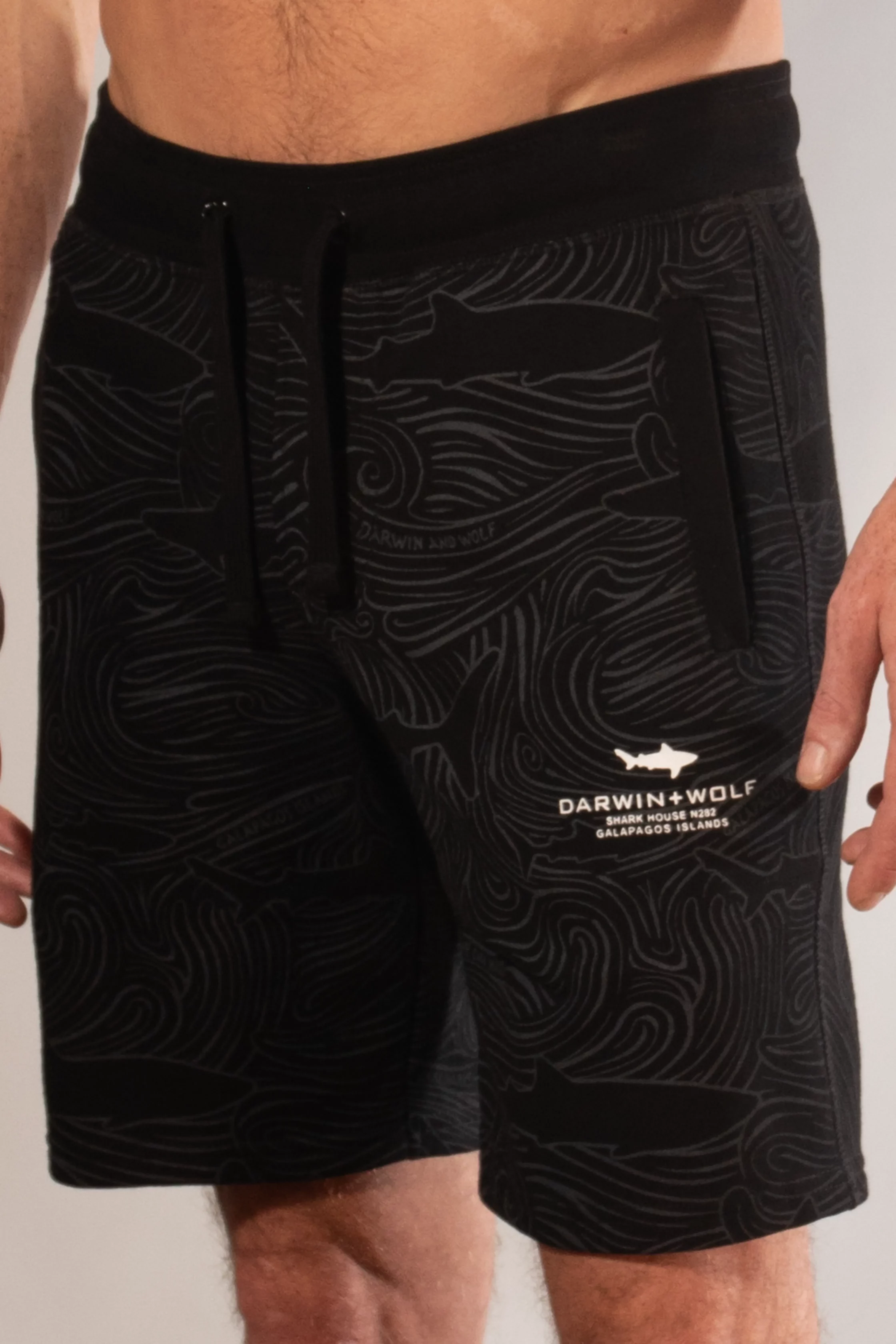Pantalón corto negro de hombre en 100% algodón, con arte de corrientes y tiburones y detalles de marca que reflejan frescura, energía y estilo versátil.