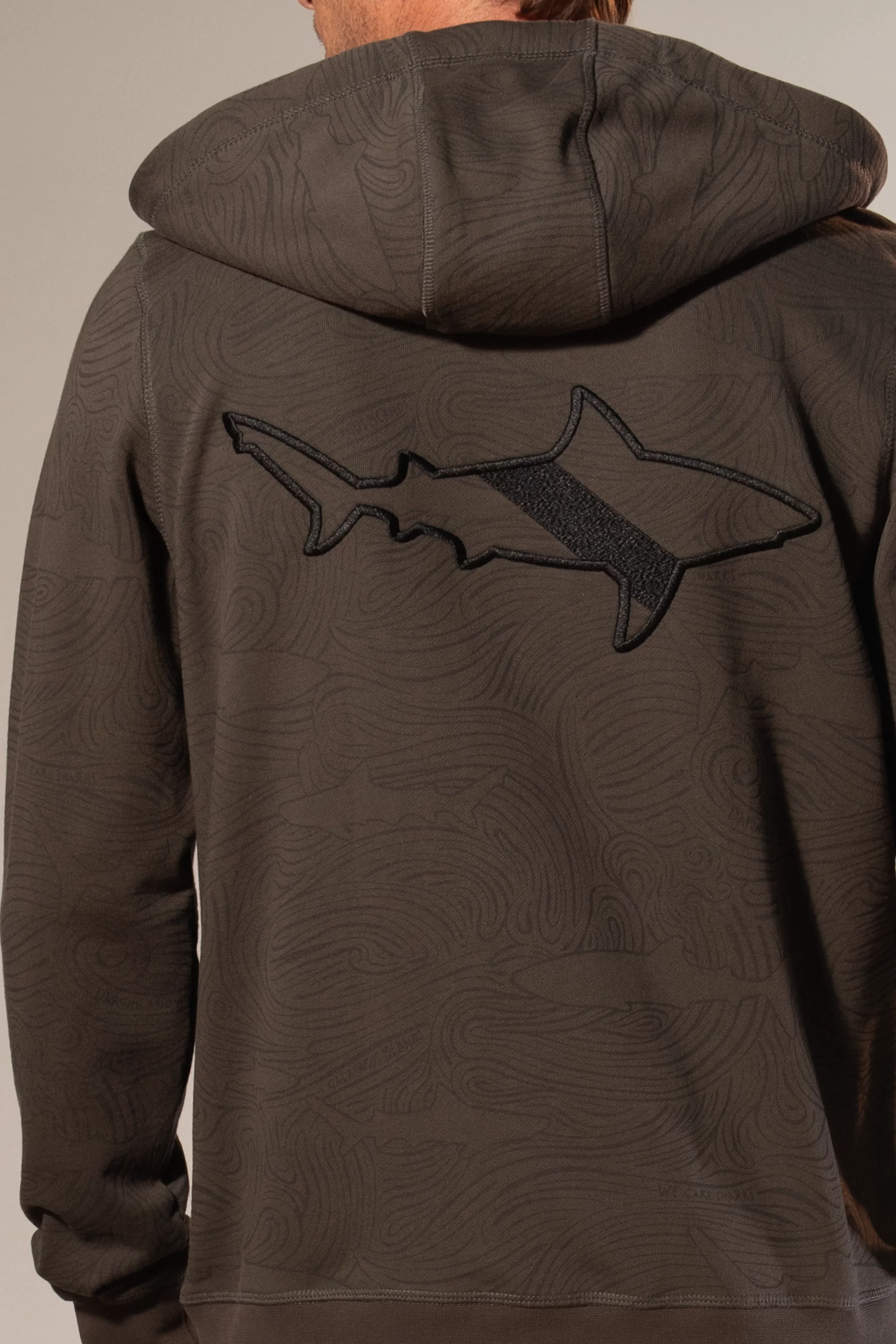 Sudadera con capucha gris y cierre, arte oceánico de corrientes y tiburones, bolsillo frontal amplio y confección en algodón para comodidad y estilo.