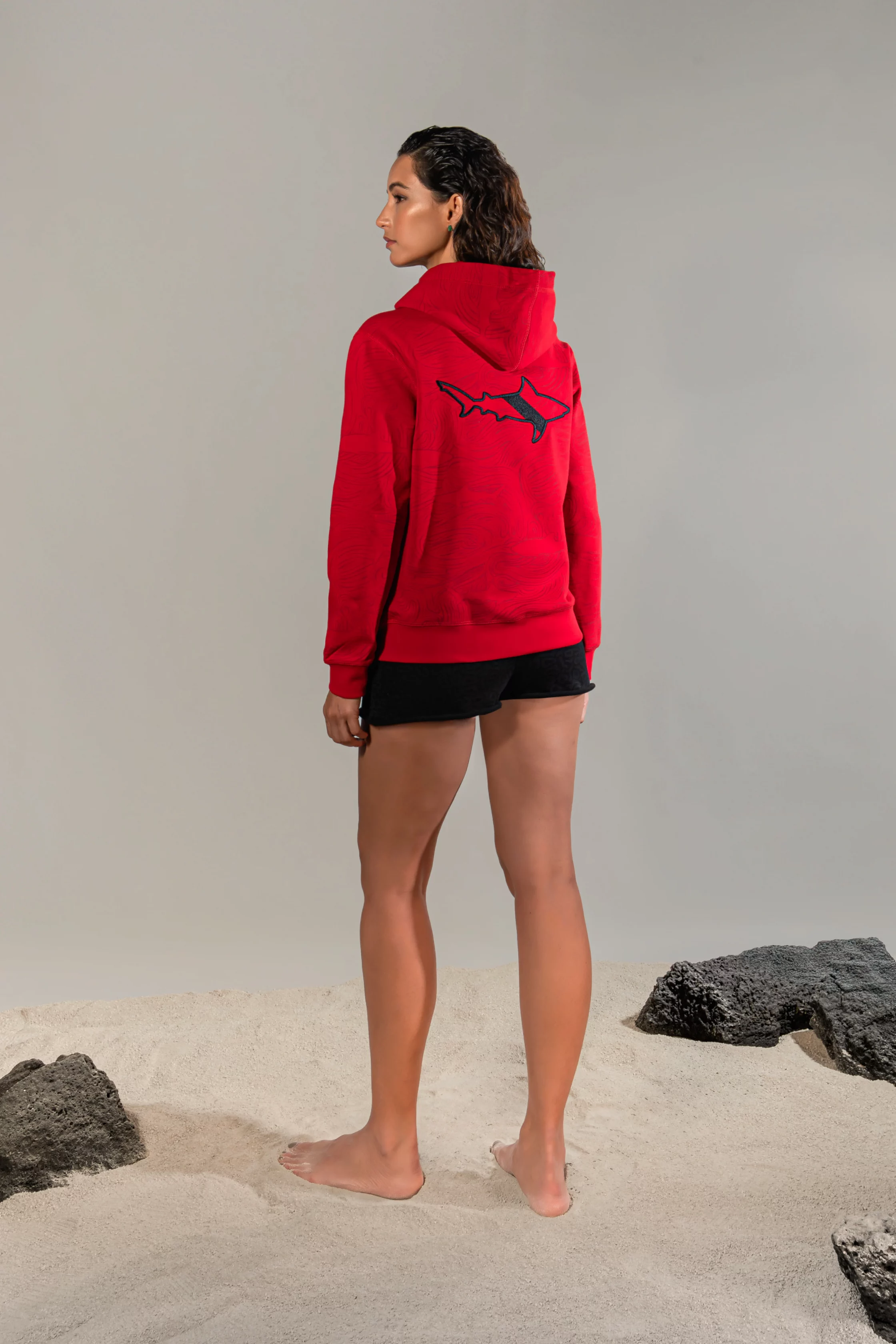 SUDADERA CON CAPUCHA CORRIENTES Y TIBURONES ROJA