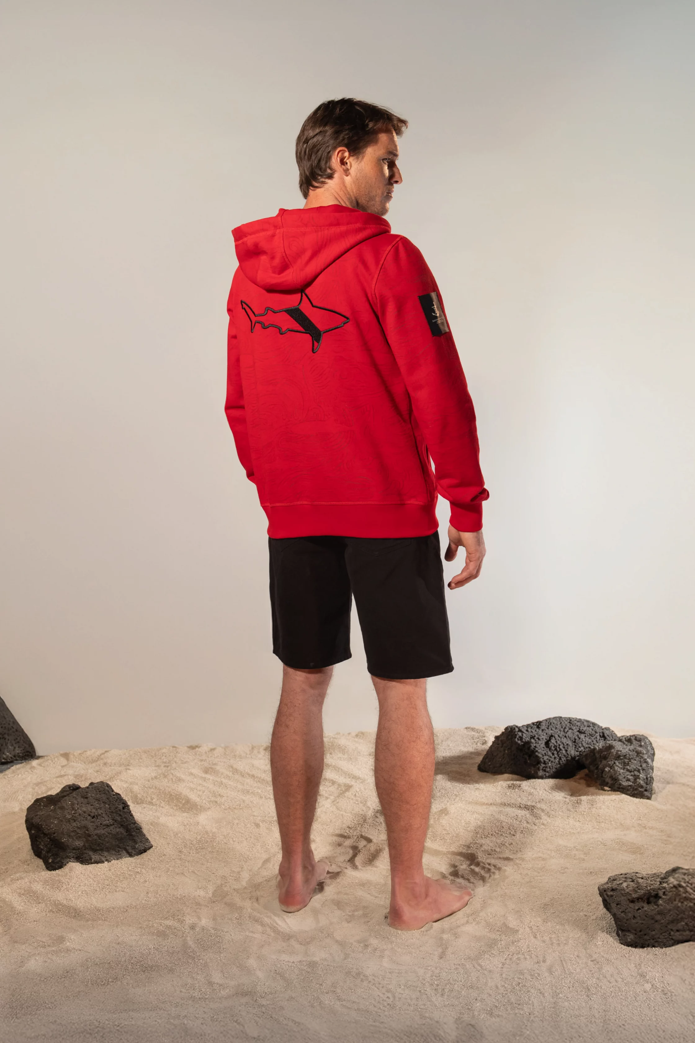 La Sudadera con Capucha Corrientes y Tiburones Roja combina funcionalidad y narrativa visual en una pieza que transmite energía oceánica. De diseño llano con cierre frontal y mangas largas, se convierte en un lienzo donde corrientes marinas y tiburones recorren toda la superficie, evocando dinamismo y movimiento. La capucha con cordones y los dos bolsillos delanteros en la zona del abdomen aportan practicidad y comodidad. Confeccionada en 100% algodón, garantiza suavidad y frescura, consolidándose como una prenda masculina versátil que une estilo contemporáneo con inspiración marítima.